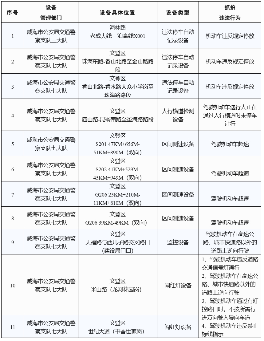 為有效預(yù)防和減少交通事故,確保道路交通安全、有序、暢通,根據(jù)《中華人民共和國(guó)道路交通安全法》及其實(shí)施條例等法律法規(guī)和相關(guān)技術(shù)規(guī)范的規(guī)定,依據(jù)《公安機(jī)關(guān)執(zhí)法公開規(guī)定》,現(xiàn)將新增11處15個(gè)交通技術(shù)監(jiān)控設(shè)備予以公示,自10月20日起,將對(duì)有關(guān)交通違法行為進(jìn)行依法管理,請(qǐng)廣大交通參與者自覺遵守道路交通法律法規(guī),共同維護(hù)良好的道路交通秩序。