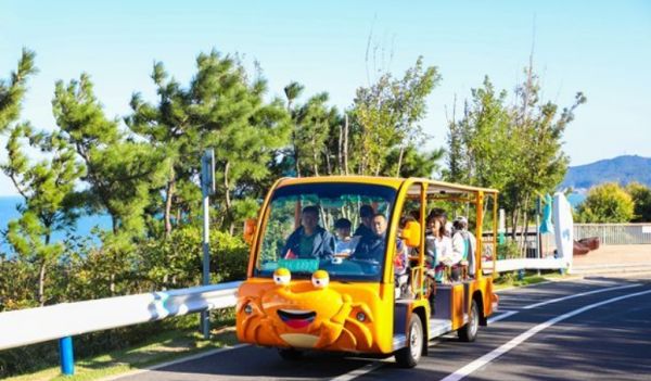卡通觀光游覽車共10輛,有貓咪和螃蟹兩種卡通造型,主要在環(huán)海路1號輔線和2號輔線內(nèi)各個(gè)觀景平臺之間運(yùn)行,招手即停。